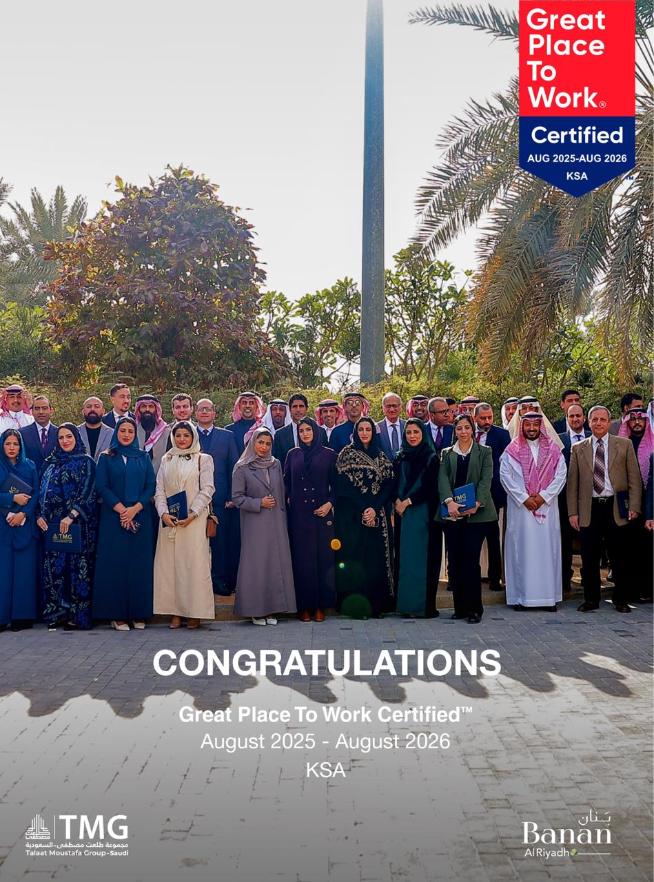 فخورين في مجموعة طلعت مصطفى السعودية بحصولنا على جائزة “أفضل بيئة عمل” لأننا نؤمن إن النجاح يبدأ من مكان يقدّر الموظف ويوفر له بيئة صحية، محفزة، مليئة بفرص النمو والتطور At TMG Saudi, we are proud to be recognized as a “Great Place to work”, a testament to our belief that true success begins with people. We foster an environment that values talent, promotes well-being, and creates opportunities for growth and development. Guided by a clear vision and a culture of appreciation and innovation, we continue to strengthen our position as one of the leading career destinations in the Kingdom.